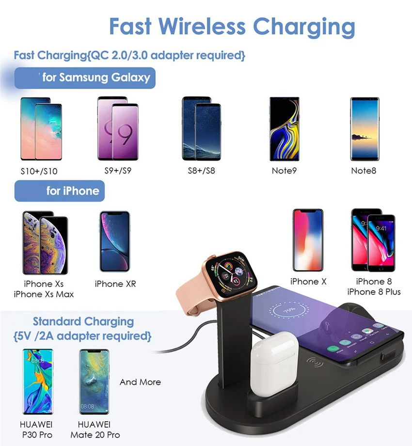 This multi-functional charger stand with iPhone/Micro USB/Type-C interfaces can charge for mostly mobile devices, such as iPhone,Samsung, LG, HTC, Huawei,Sony and more.