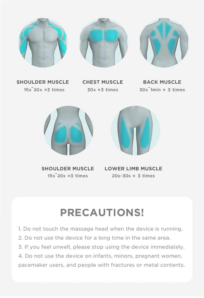 - Stiffness and Soreness Relief: The massager is used to relieve muscle stiffness and soreness, promote blood and lymph circulation, accelerate recovery after exercise and sports injuries, improve overall health of the body's soft tissues, and prevent inflammation caused by adhesion between the fascia and muscles.